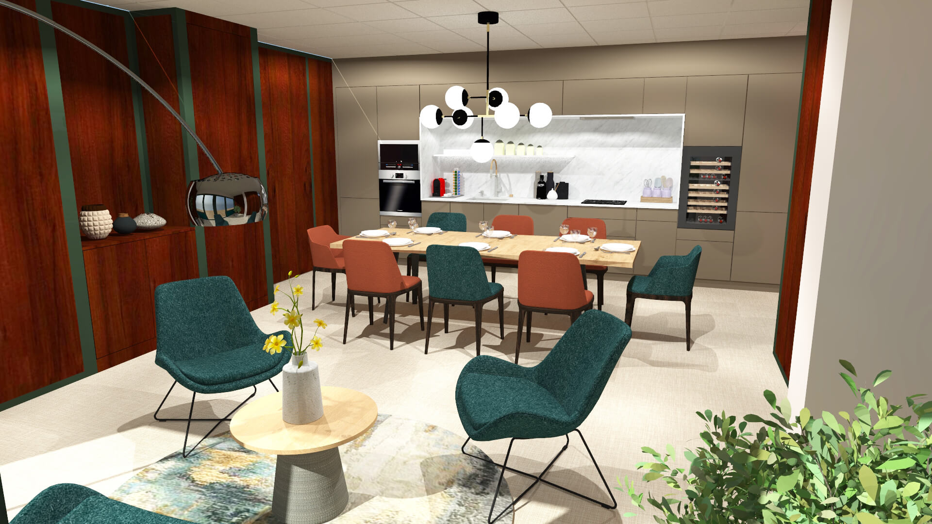 Le mobilier choisi est cossu et confortable pour retranscrire cette envie de bien accueillir. Dans la cuisine, une grande table en bois a naturellement été choisie pour favoriser les échanges et la convivialité autour de bon repas. Le bureau du directeur est placé en biais dans la pièce afin de montrer son ouverture et signifier l’invitation à entrer dans son bureau.