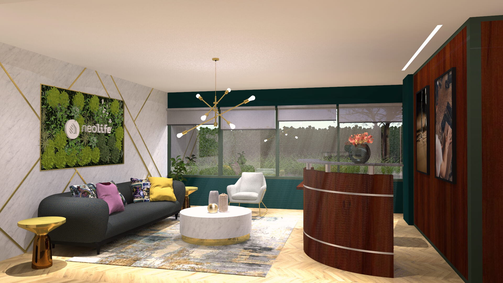 Dans le hall d’entrée, nous avons choisi de travailler des matières naturelles comme un parquet posé en chevron à la française pour le sol, un tableau végétal avec incrustation du logo, sublimé par des panneaux de marbre de carrare blanc.