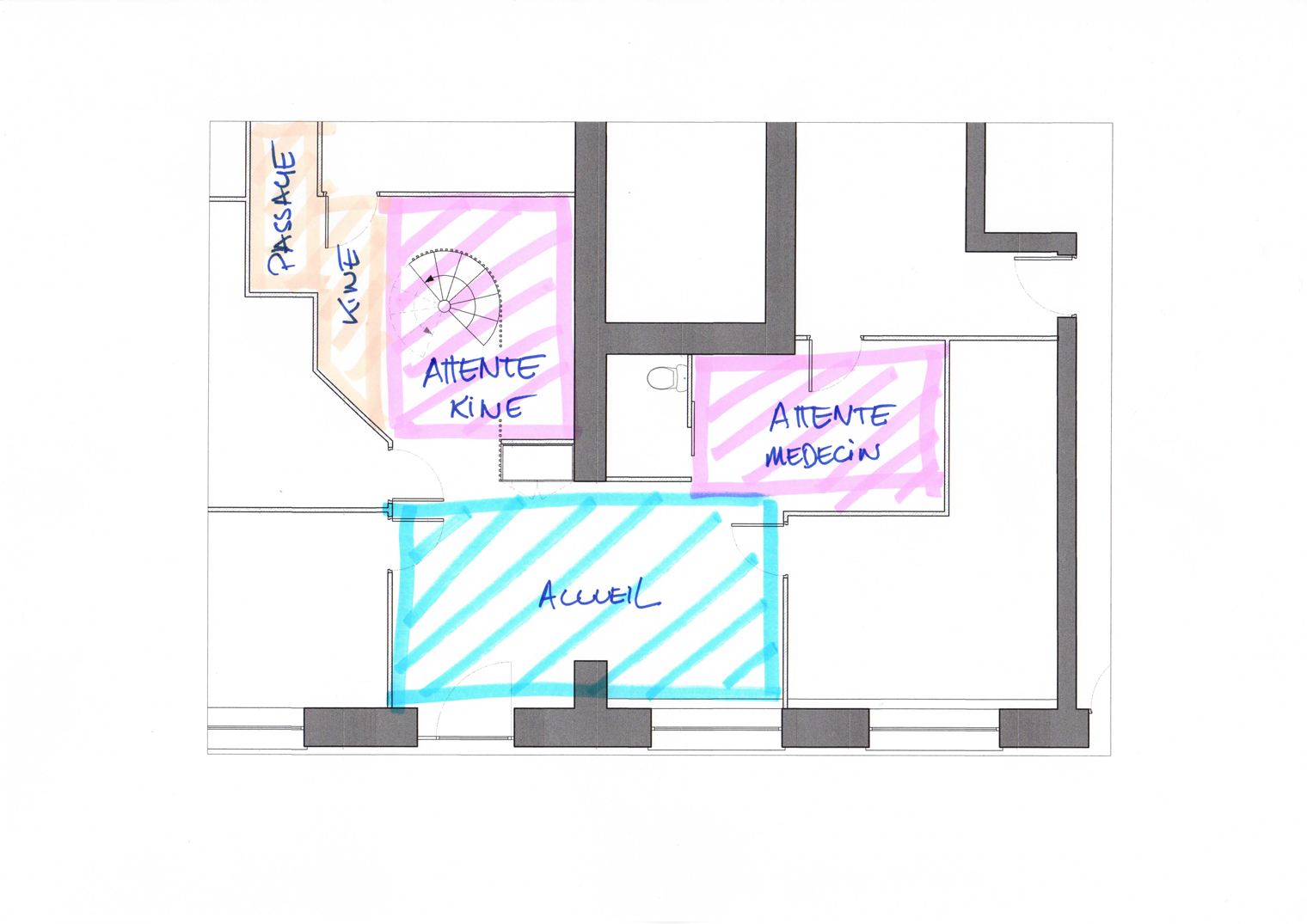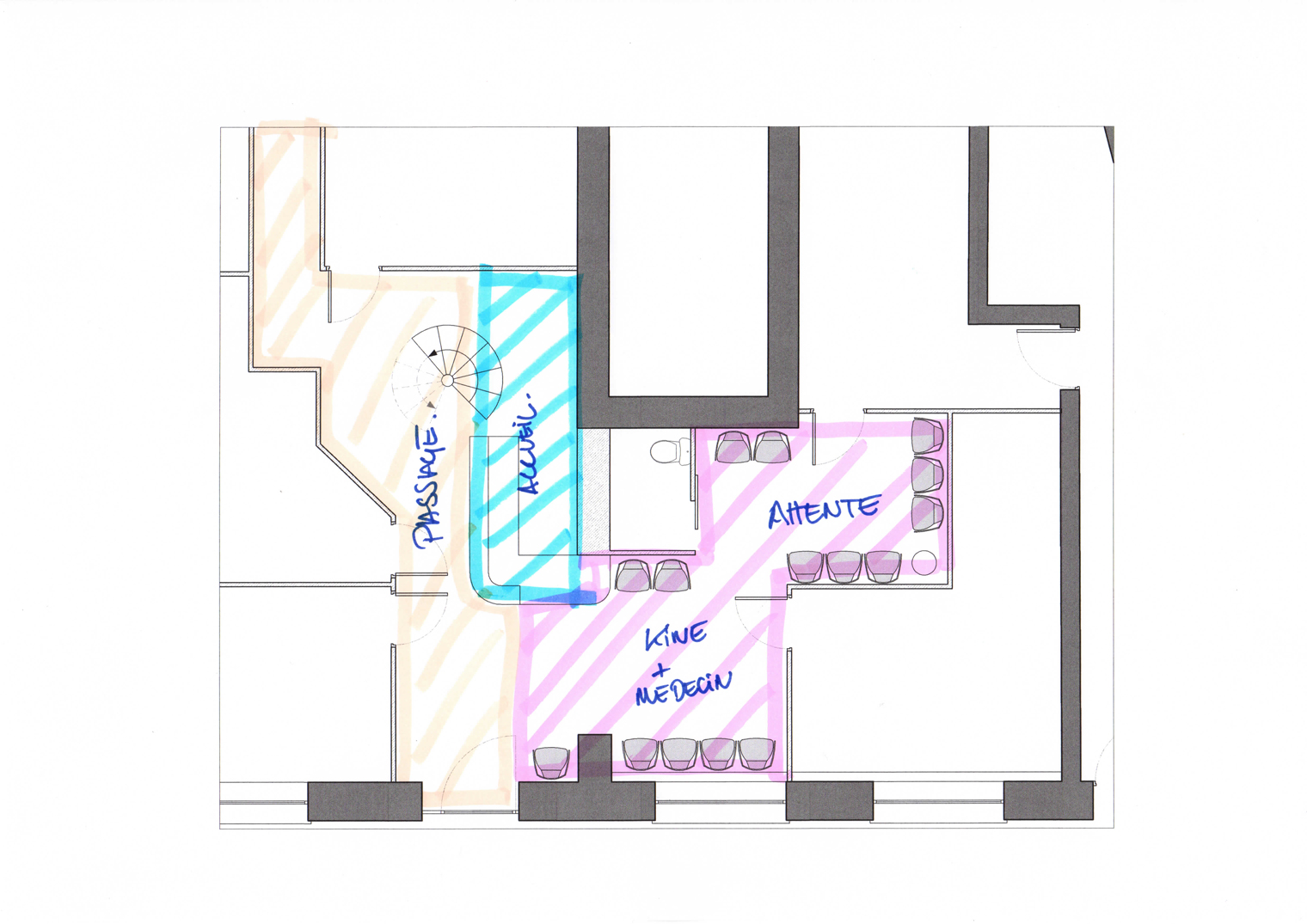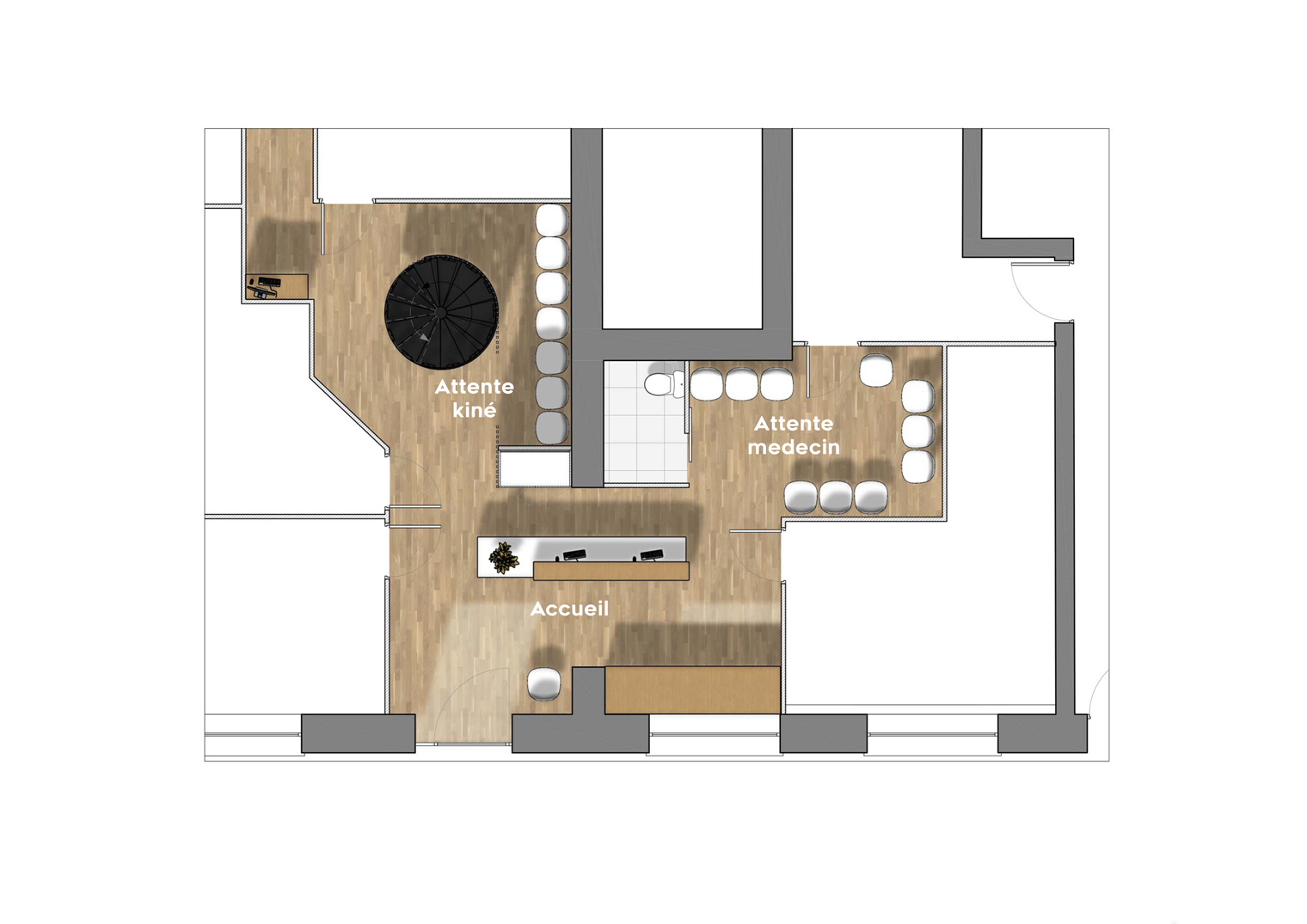 L’idée est de remettre l’accueil au centre afin de créer deux espaces d’attente, 1 pour les kinésithérapeutes et 1 autre pour les médecins généralistes. En therme de décoration, il est important de réchauffer l’atmosphère avec des ton chaud et naturels comme le bois, et surtout de créer une ambiance accueillante et relaxante.