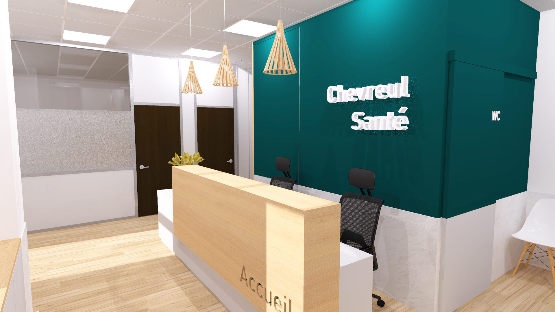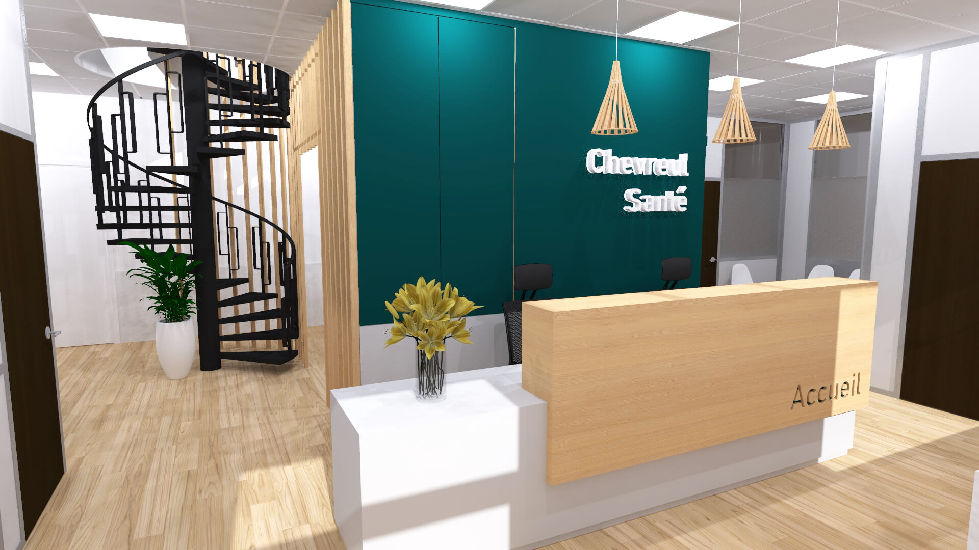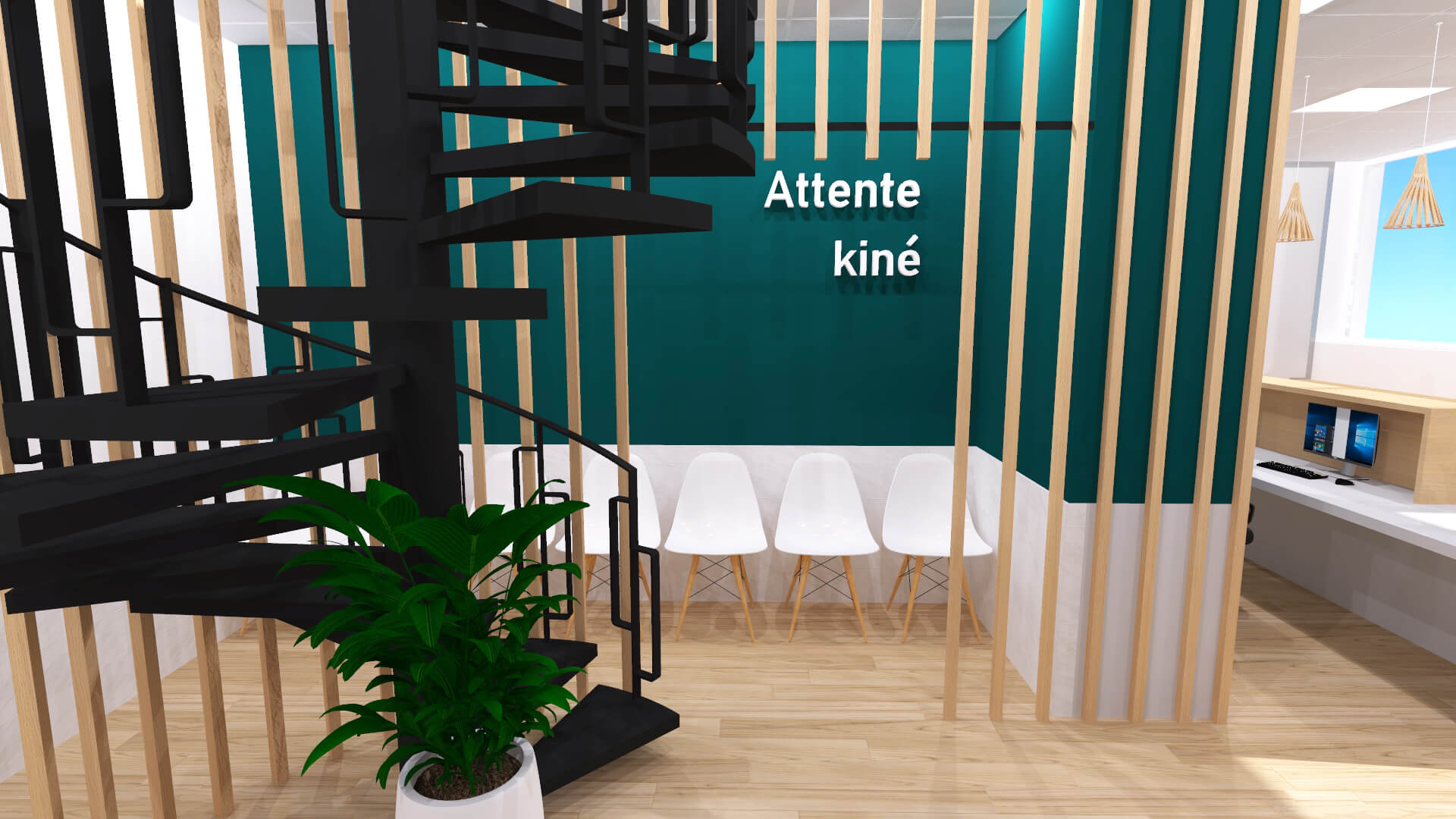 L’idée est de remettre l’accueil au centre afin de créer deux espaces d’attente, 1 pour les kinésithérapeutes et 1 autre pour les médecins généralistes. En therme de décoration, il est important de réchauffer l’atmosphère avec des ton chaud et naturels comme le bois, et surtout de créer une ambiance accueillante et relaxante.