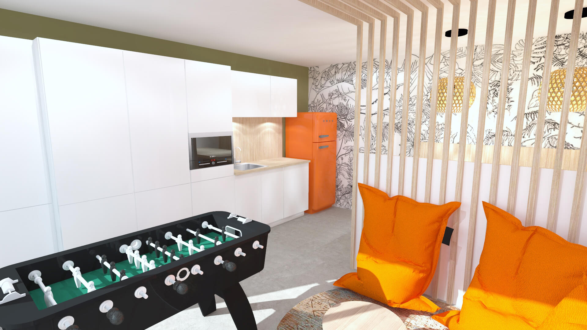 C’est donc tout naturellement que nous avons prit la nature comme point de départ. L’élément central, en bois et métal, avec l’intégration de plantes suspendues, sert de filtre naturel entre les équipes mais reste ajouré afin de ne pas couper le regard et laisser passer la lumière.