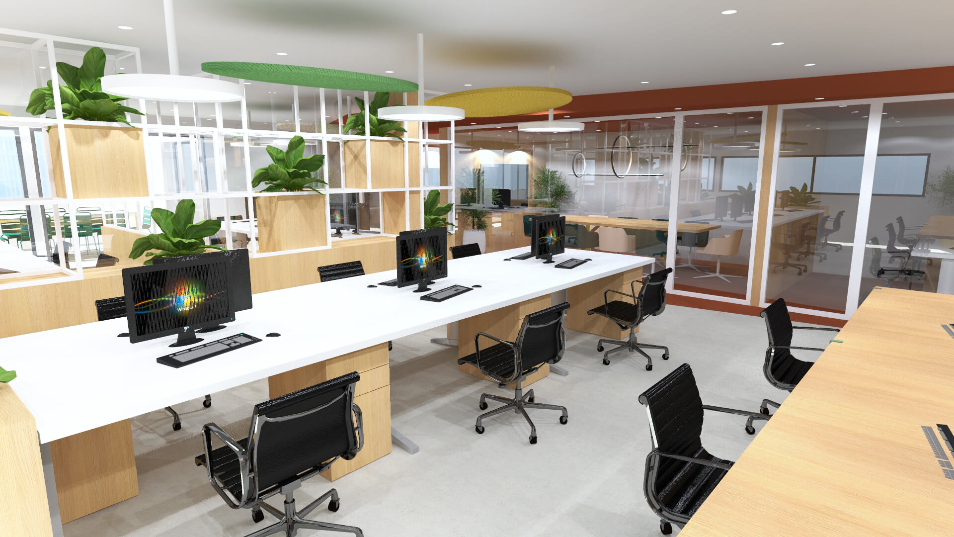 C’est donc tout naturellement que nous avons prit la nature comme point de départ. L’élément central, en bois et métal, avec l’intégration de plantes suspendues, sert de filtre naturel entre les équipes mais reste ajouré afin de ne pas couper le regard et laisser passer la lumière.