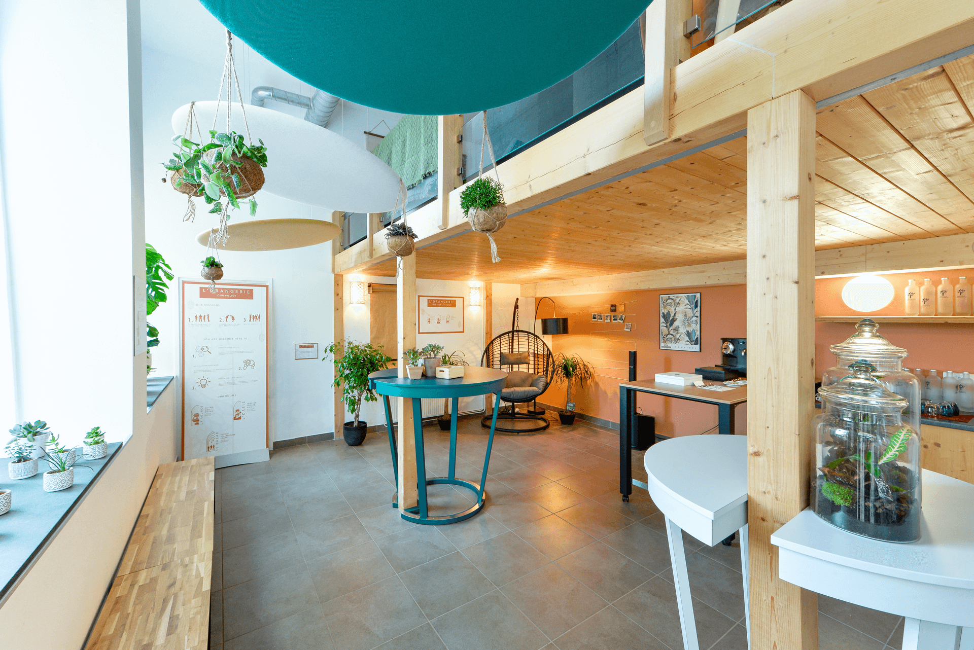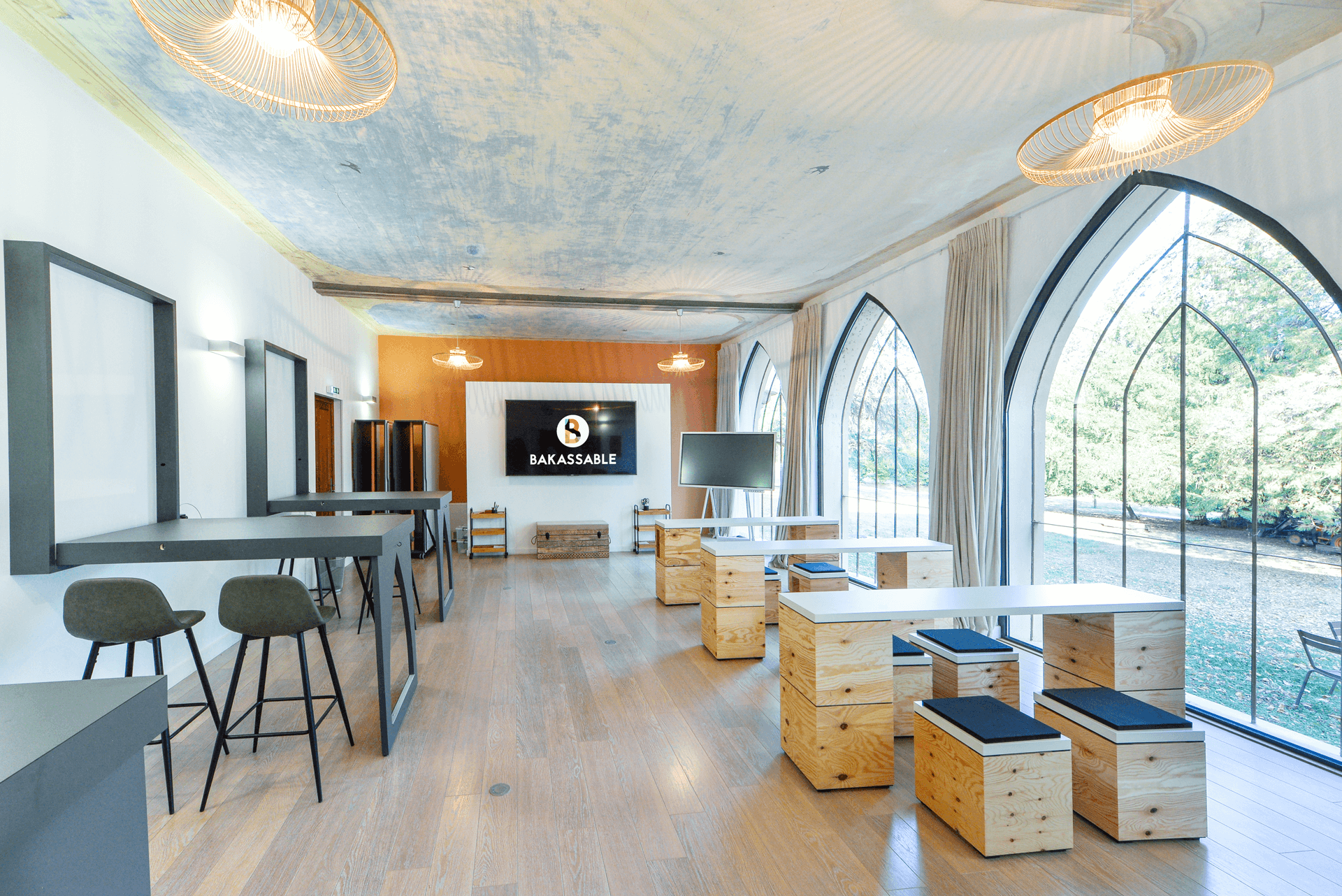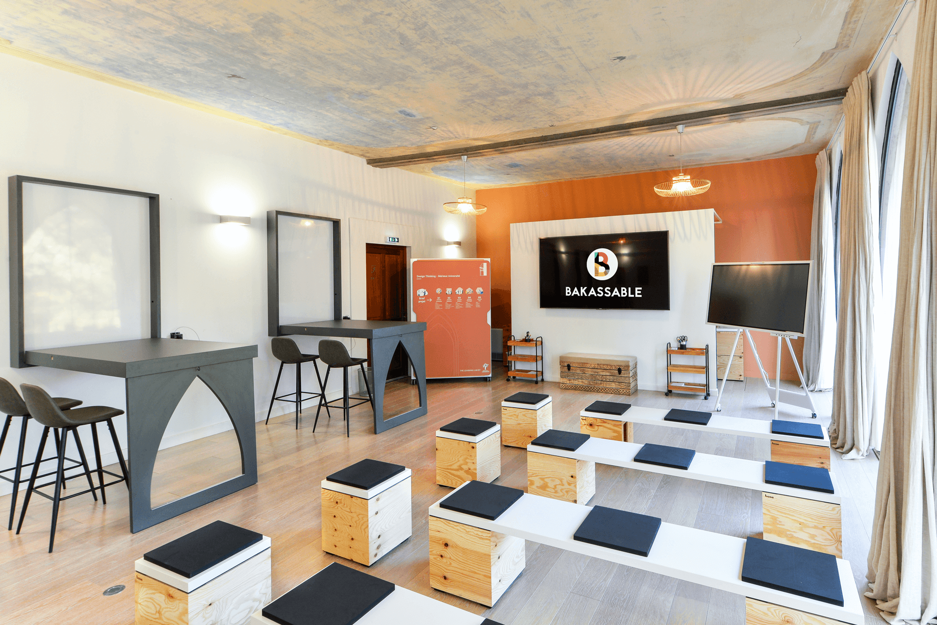 Dans le premier espace, multiservice, nous avons placé 2 grandes tables conviviales, qui servent de point central aux différentes destinations du lieux : l’accueil par le formateur, les différentes poses café et repas prévus dans la journée et enfin un mur « photoshoot » pour immortaliser la journée que les formés viennent de passer.